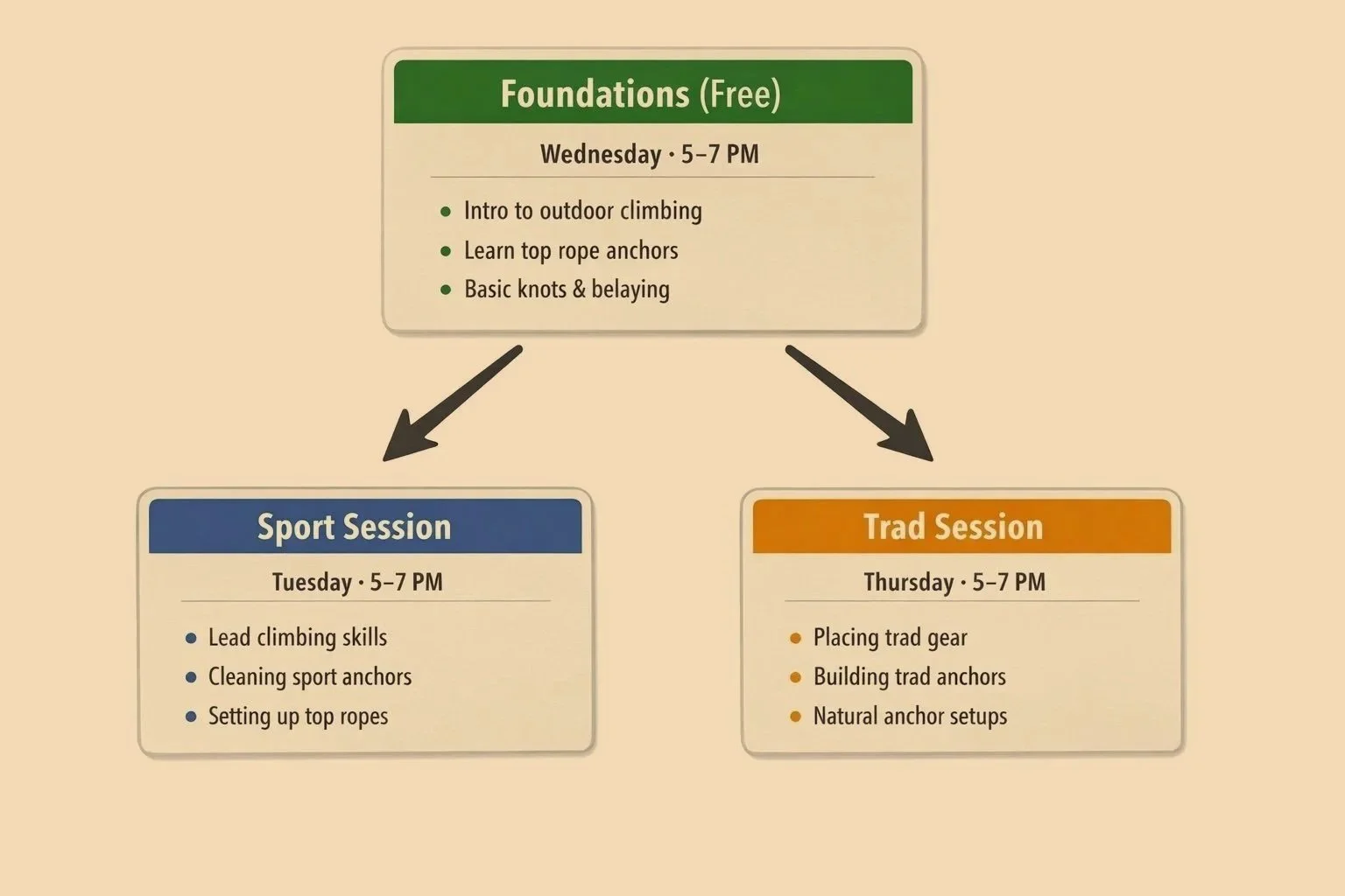 Start with the free Foundations session, then progress into Sport or Trad training on real rock.